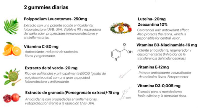 Gummies solares con acción antioxidante formuladas a base de polypodium leucotomos, vitaminas B3, C, E y D3, luteína y zeaxantina. Ayuda a prevenir el fotoenvejecimiento derivado de la exposición solar. Sabor a pomelo. Fórmula 100% vegana. Sin gluten. Sin lactosa